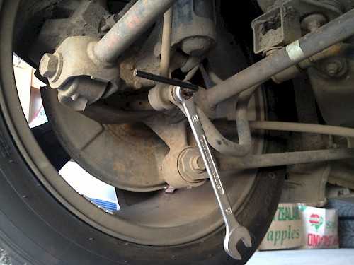 На стойке стабилизатора находится обжимная гайка, поэтому открутить ее трудно. Рекомендуем заранее очистить резьбовое соединение металлической щеткой и пшикнуть ВД-40 или использовать тормозную жидкость.