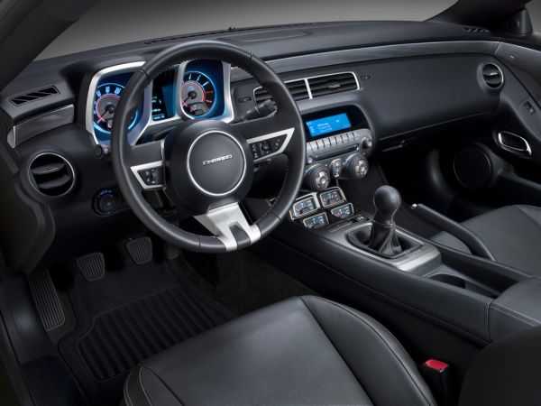 Салон… в этом плане новый Камаро – атипичный «америкос», точнее частично. Пластик традиционно “дубовенький”, но на вид торпедо – одно из лучших за всю историю американских “масэлов”! Ну, это наше мнение. Перед глазами – утопленные колодцы в ретро-футуро-стиле, справа внизу – отдельные датчики (температура масла, зарядка аккумулятор и пр.). Особенно нарядно выглядит салон ночью – когда зажЫгаются бирюзово-белые огоньки. Посадка – что надо. Ни фига не видно… бункер на колесах. Лобовое стеклышко как в старом ЗИЛе, а боковые окна – как прямоугольные иллюминаторы в подводной лодке. Кто страдает клаустрофобией – придется или лечиться, или брать другую машину. Сидушки трудно назвать анатомическими. Развитая боковая поддержка есть и в поворотах они держат, но все равно сползаешь…