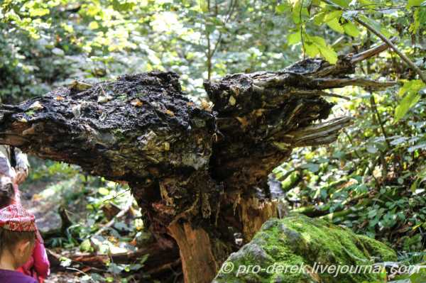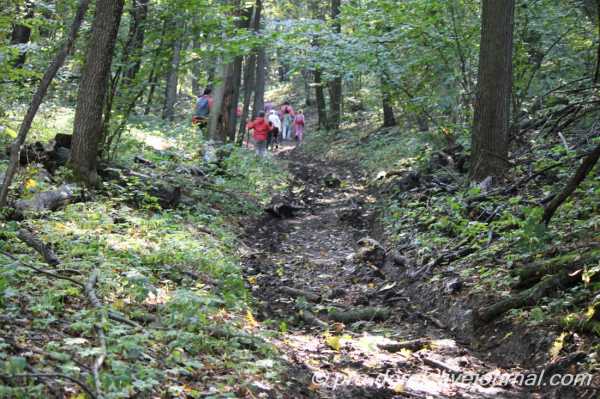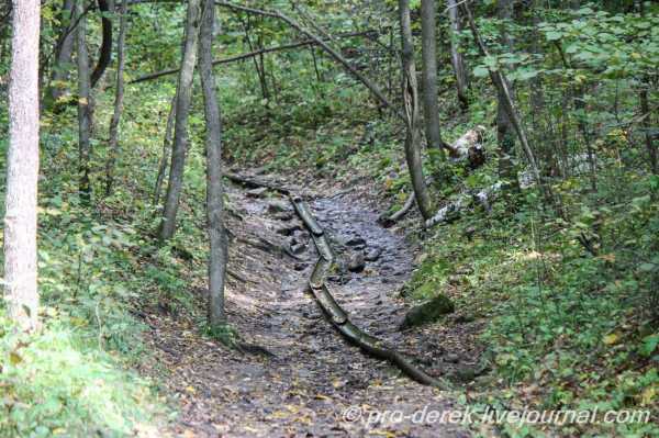 Тропинка спускается в глубокие заболоченные лощины, взбирается на крутые горы и в конце концов приводит нас к небольшому ручейку, весело журчащему среди бурелома и валежника.