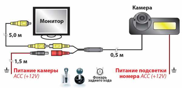 Подключить камеру можно к габаритам или к фонарю заднего хода. Последний вариант предпочтителен, т. к. питание будет подаваться только после включения задней передачи. Красный провод (+12 В) подключается к фишке фонаря, а черный — через светильник освещения номера, к корпусу (масса).