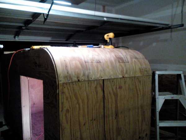 Чтобы у капсулы была округленная форма, надо ее вырезать из специальной влагоустойчивой фанеры. В верхней части можно сделать настил, на петли поставить двери, окна можно сделать из поликарбоната или оргстекла.