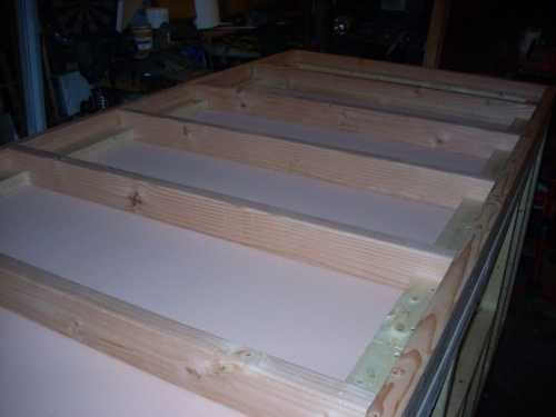 Под крепление откидных рундуков по каркасу варим продольные связи, крепление болтовое, по три петли на каждый рундук. Нам нужна прочность конструкции, поэтому каркасы рундуков сварные из профильной трубы. Петли приварены к каркасам рундуков с учетом толщины матраса.