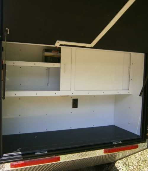Шкафы для хранения выше ножки кровати с пространством для небольшого LED-телевизора или планшета, iPad с динамиками или радио и DVD/CD-плеер или это пространство под может быть использовано для ящиков. Все устройства будут питаться от солнечной панели, которая находится на передней части автофургоне.