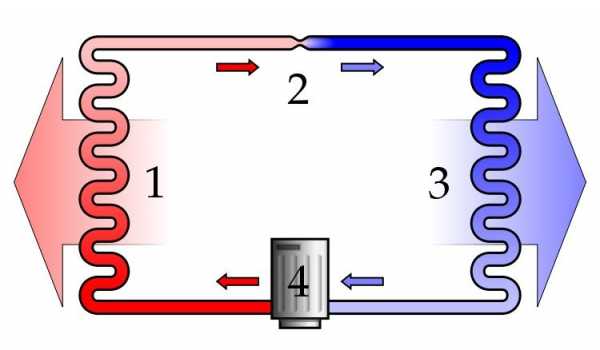 Схема автомобильного кондиционера: 1. Конденсор; 2. Расширительный клапан; 3. Испаритель; 4. Компрессор.