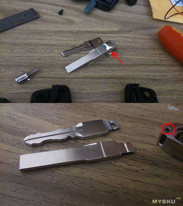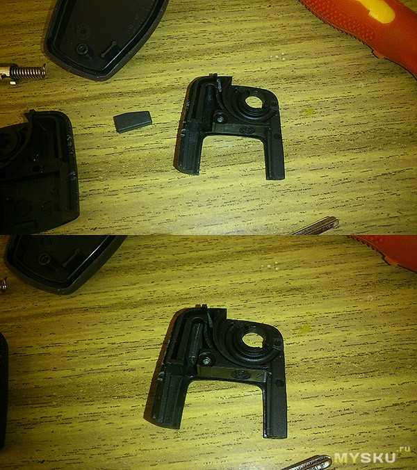 Надоело мне, что при ношении ключа зажигания в кармане, он то рвал карман, то «втыкался» в ногу, да и вообще не очень удобно в кармане носить было. Решил купить тушку-выкидушку для ключа. Пластик на ощупь намного приятнее чем у стокового ключа, да и качество исполнения со сборкой удивила своей аккуратностью. Разбирается очень легко — выкручиваем винтик и разбираем на 2-е половины. Тут же все распадается на составные части: Первым делом переставил чип иммобилайзера, в новом ключе есть место под него, входит как родной, но я еще добавил кусочек скотча М3 на всякий случай. Дальше нужно заменить жало, для этого выбиваем крепежный штырек. После долгое и кропотливое подтачивание родного жала. Маркером отметил на сколько оно должно торчать из ключа.