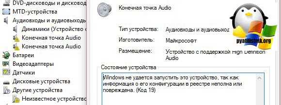 «Windows не удалось запустить это устройство, поскольку информация о его конфигурации в реестре неполна или повреждена. (Код 19)»