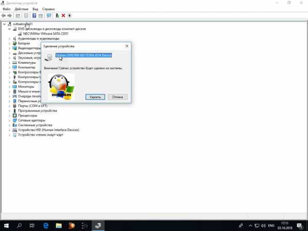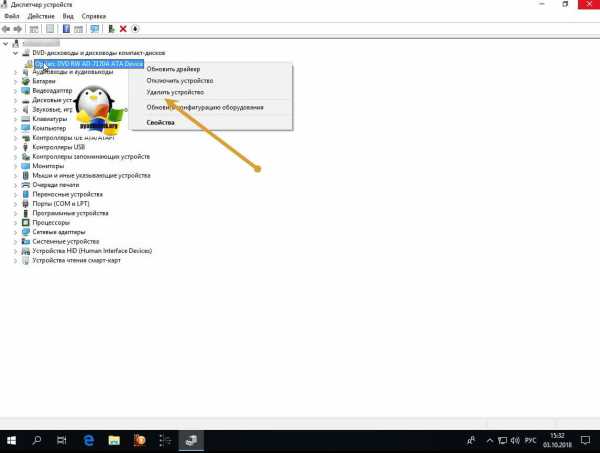 1. Откройте «Диспетчер устройств». Найдите строку «DVD и CD-ROM дисководы» и нажмите на стрелочку слева от нее. Откроется список ваших DVD и CD-устройств. Выделите ваш привод и нажмите правую кнопку мыши и выберите пункт «Удалить». На вопрос системы о подтверждении действия, нажмите <ОК>.