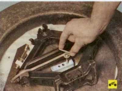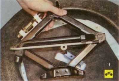 5. и извлеките из багажника домкрат в сборе с ключом для гаек крепления колес.