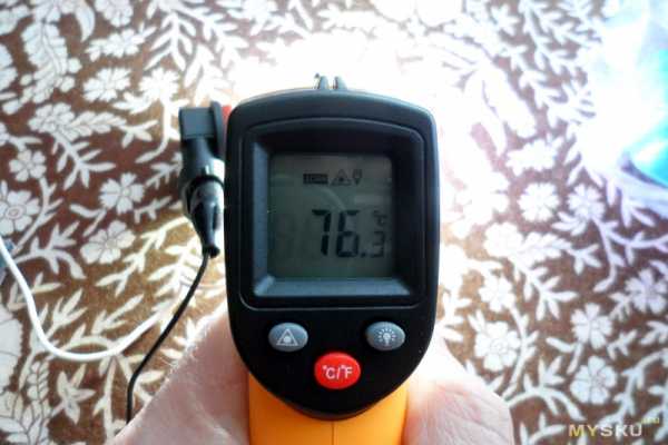 Хотя, с другой стороны, чем меньше мощность, тем меньше тепла выделяется, что в нашем случае очень важно. Так что заодно измеряем температуру лампочки. Самыми горячими ожидаемо оказались диоды. Максимальная температура нагрева составила 76,3 градуса.
