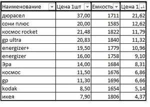 Результаты сведены в таблицу. Если честно они меня слегка ошеломили. Я не ожидал, что емкость дорогущих и распиаренных брендов будет практически одинакова с дешевыми батарейками.