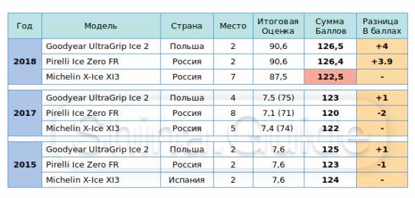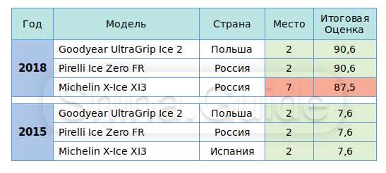 Все они в 2015 году по итоговой сумме баллов разделили общее второе место. Спустя три года Pirelli Ice Zero FR и Goodyear Ultragrip Ice 2 снова разделили 2-е место итогового рейтинга. При этом модель Michelin X-Ice Xi3 в 2018 году заняла 7-е место.