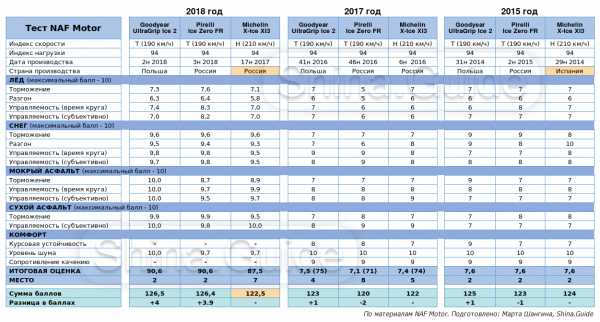 Аналогичный провал в результатах случился в тесте Motor 2017 года. Так, Goodyear Ultragrip Ice 2 польского производства и Michelin X-Ice Xi3 российского заняли 4-е и 5-е места соответственно с минимальным отрывом в 0,1 балла, будучи потесненными с вершины рейтинга моделями Continental ContiVikingContact 6 и Sava Eskimo Ice.