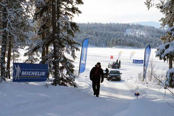 Специально для журналистов Michelin арендовал небольшой участок озера на севере Швеции у местного фермера (частная собственность куда не плюнь) и организовал там 3 ледяные трассы, по которым мы и устроили гонки на автомобилях Audi A3, Volvo V40 (экспресс тест-драйв: http://prohorov.livejournal.com/289158.html) и BMW 1M.