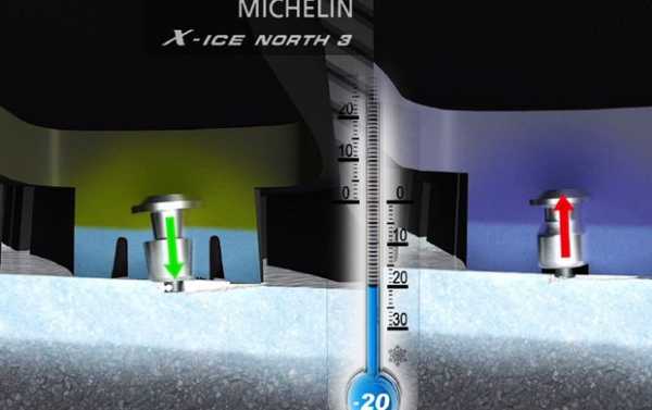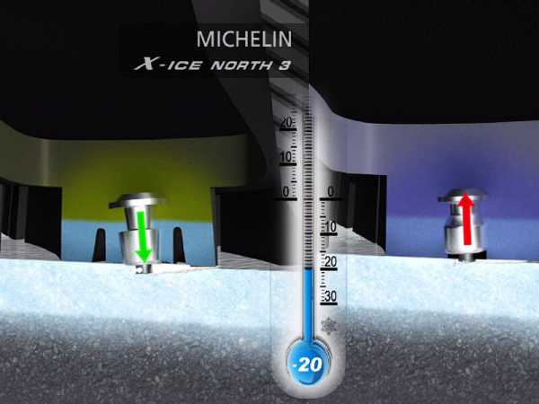 При создании X-Ice North 3 применяется термоактивная резиновая смесь: внутренний слой материала меняет свою жесткость в зависимости от температуры окружающей среды. Соответственно, когда на улице холодно, твердость резины увеличивается, и шип сильнее давит на поверхность, «вгрызаясь в лед».