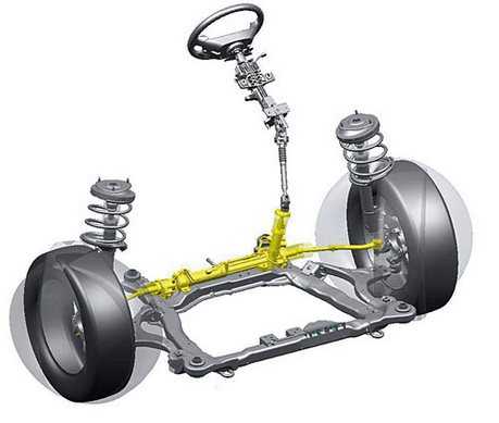 Основным механизмом реечного управления является зубчатая рейка, назначение которой заключается в том, чтобы перемещать ведущую шестерню, в свою очередь связано с рулевым колесом, то есть устройство данного механизма довольно простое и как следствие этого надежное.
