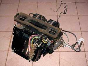 Теперь обсудим, как установить кондиционер в авто без помощи квалифицированных слесарей. Ставим машину на ровную поверхность, глушим, отключаем зажигание и приступаем к работе. Теперь отыщите место расположения старого отопителя и снимите его, также частично раскрутите приборную панель вашего автомобиля, ведь там придется поставить панель для управления функциями кондиционера. Далее сливаем весь антифриз и снимаем корпусы воздушных фильтров. Затем необходимо демонтировать бампер, вентилятор и воздушный фильтр с двигателя.