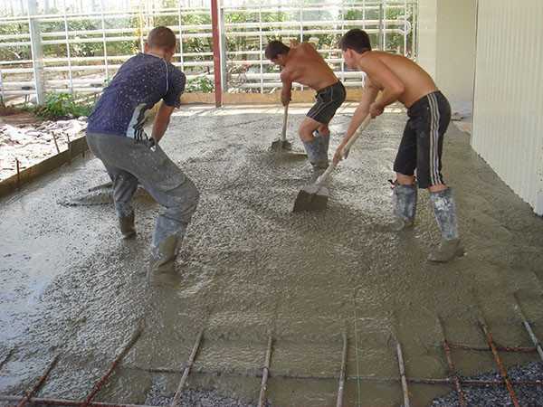 Заливка бетонной смеси начинается с дальнего угла. Материал заливают чуть больше уровня маяков. При помощи рейки (правило), выравнивают поверхность в каждой секции. Этот процесс называется стягиванием пола.