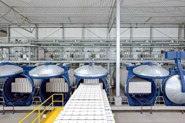 Пропаривание в автоклавах (на фото – серийное производство газобетона)