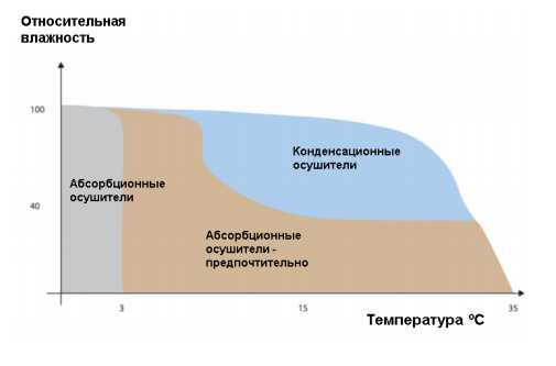 На диаграмме, предлагаемой производителями осушителей воздуха, показано, какой вид осушителей предпочтителен для применения в строительстве при различных условиях влажности и температуры.