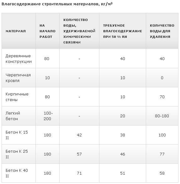 По условиям технического процесса, из недавно уложенного бетона в помещение регулярно выделяется определенное количество влажности. Это зависит от толщины просушиваемого слоя, состава бетонной смеси и количества времени сушки. Сам же процесс осушки бетонных материалов зависит от температуры воздуха и уровня его влажности. Нормы и цифры приводятся в разных источниках разные: в зависимости от состава смесей, примесей и технологии их применения. Допустимые температуры для проведения строительных работ: +3 …+25 °C. А при температурах ниже + 5 °C бетон схватывается в несколько раз дольше. При значениях ниже -4 °C вода в бетоне может замерзнуть, при этом, затвердевание прекращается, и на прочность бетона не будет никаких гарантий. Условия для сушки бетонных стен и стяжек требуют таких же теплых температур.