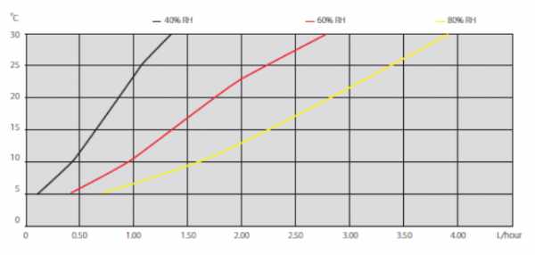 Такие зависимости показывают, что для определенных погодных условий производительность осушения различная. Данные производительности при разных значениях влажности и температуры указываются в Паспорте устройства.