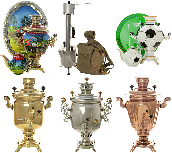 Интернет-магазин «Русский самовар» предлагает такие дровяные самовары: новые, восстановленные советских времен и антикварные.