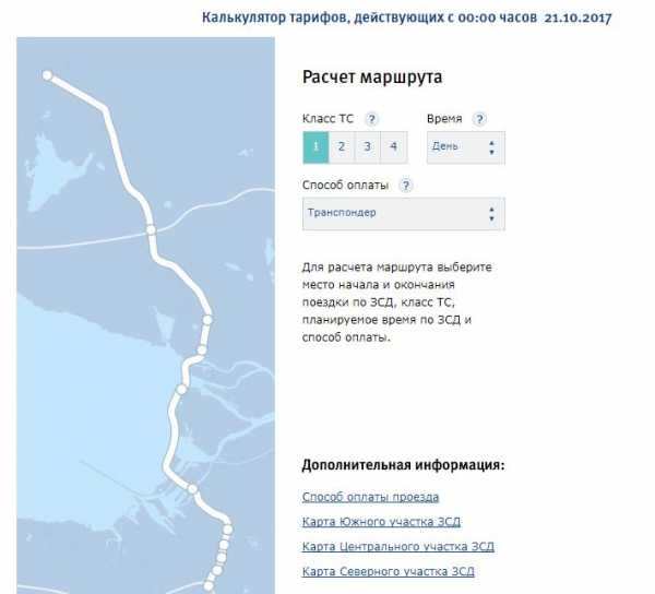 Калькулятор тарифовПри этом Вам понадобится указать класс транспортного средства (от первого по четвёртый), время проезда (день или ночь) и способ оплаты (транспондер, наличные или банковская карта). Здесь же потребуется выбрать место начала и окончания поездки по ЗСД.