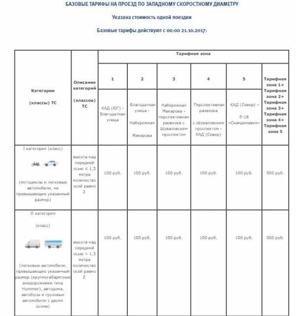 В разделе «Оплата проезда» Вы сможете ознакомиться с базовыми тарифами на проезд по Западному скоростному диаметру в 2017 году. Вся информация представлена в таблицах, где указана стоимость одной поездки. Здесь же доступны сведения о категориях транспортных средств и их описание, перечень тарифных зон.