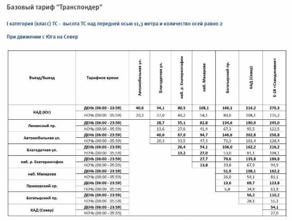 Здесь Вы сможете ознакомиться со стоимостью при движении с Юга на Север и в обратном направлении для различных категорий транспортных средств. Базовые тарифы на проезд по платным участкам автомобильной дороги действуют в тарификационное время с 06:00 до 23:59. В то же время в тарификационное время с 00:00 до 05:59 действует скидка 50% от базового тарифа (тарификационное время определяется автоматически при заезде пользователя на дорогу).