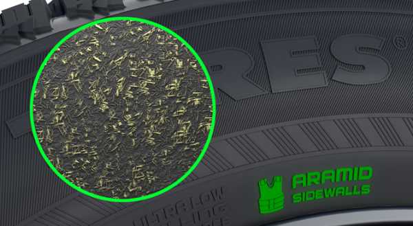 При изготовлении было применено волокно на основе арамида. Об этом свидетельствует надпись на боковой части шины. Данный компонент защищает от ударов и быстрого стирания изделие.