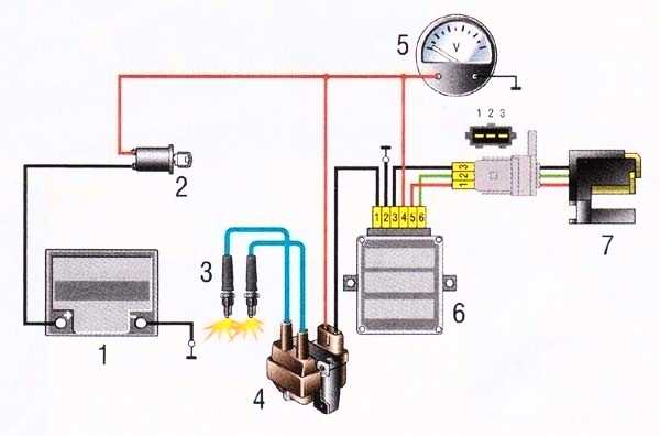 1 – датчик Холла; 1а – выходной сигнал; 2 – коммутатор; 3 – замок зажигания; 4 – дополнительный резистор; 5 – шунтирование дополнительного резистора; 6 – катушка зажигания
