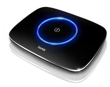 В корпусе встроен достаточно мощный, но тихий вентилятор. На крышке есть прозрачная (как я потом поняла) шторка регулировки выходящего потока воздуха. Также там есть две кнопки: Включение + величение скорости вентилятора и турбо (выработка) ионов. Когда прибор включен шторка, которая до этого казалось черной, становится полупрозрачной и виден голубой свет внутри. Также кнопки имеют подсвечивающиеся шкалы, подсветка нормальная, её видно и днём и ночью по глазам не бьёт, опять производитель всё продумал.
