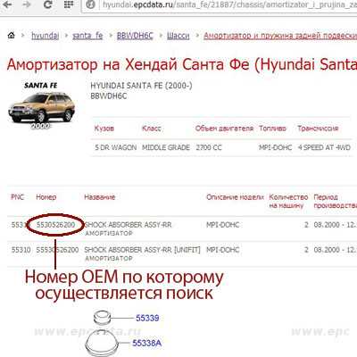 Для наглядности приведу иллюстрации на основе каталога EPCDATA.RU, но поиск по другим каталогам принципиально не различается. В примере осуществляется поиск амортизатора для Хендай Санта Фе.