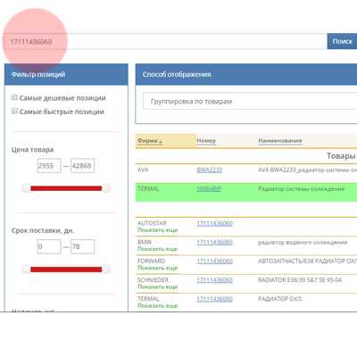 8. После всех вышеперечисленных действий в отдельной вкладке откроются ценовые предложения на искомую деталь, а также список всех доступных для приобретения заменителей (аналогов) данной запчасти. Вы будете видеть все предложения, имеющиеся В НАЛИЧИИ на наших складах в г. Барнауле, а также возможные для заказа из других городов. Все детали по умолчанию группируются по производителю. Но также Вы можете изменить сортировку на «Сквозную» — все товары будут построены единым списком. Сортировка возможна по любому из столбцов. Все цены указаны для г. Барнаула.