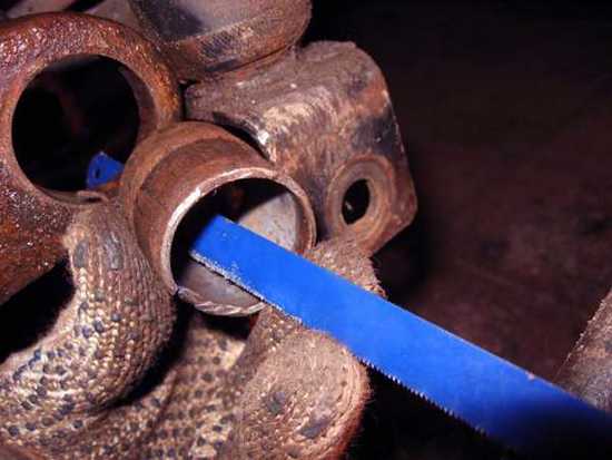 Распил внутренней втулки. Для этого потребуется качественная ножовка по металлу, с помощью которой необходимо осуществить распил металлического кольца с двух сторон. После надреза резину можно будет вынуть с помощью простой отвертки и молотка. На этапе распила очень важно соблюдать осторожность, так как есть риск задеть ножовкой часть рычага.