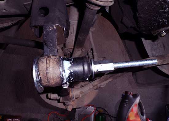 Выпрессовку старых сайлентблоков и запрессовку новых проводим, воспользовавшись винтовыми приспособлениями. При запрессовке нового сайлентблока его и конусную втулку смазываем жидкостью для мытья посуды. Если амортизатор снят с автомобиля, можно воспользоваться прессом. При этом винт с гайкой заменяется оправкой.