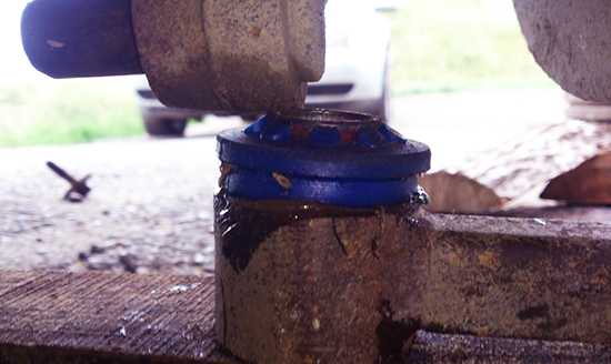 3.Начать выпрессовку. Усилие на сайлентблок увеличивать постепенно, чтобы исключить перекос, деформацию оправки и посадочного места. Старайтесь не повредить посадочное место.