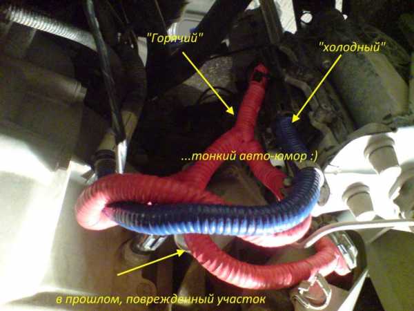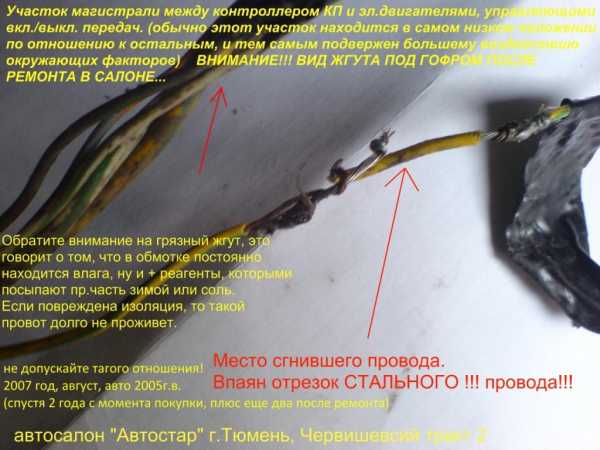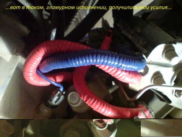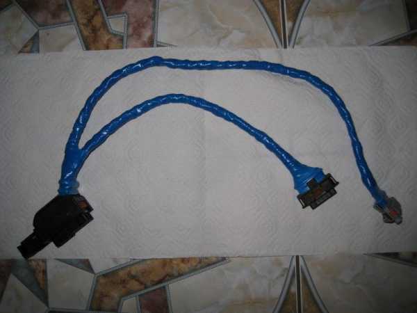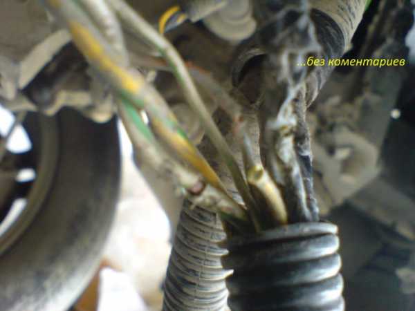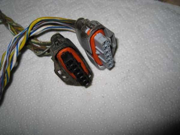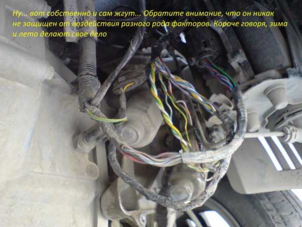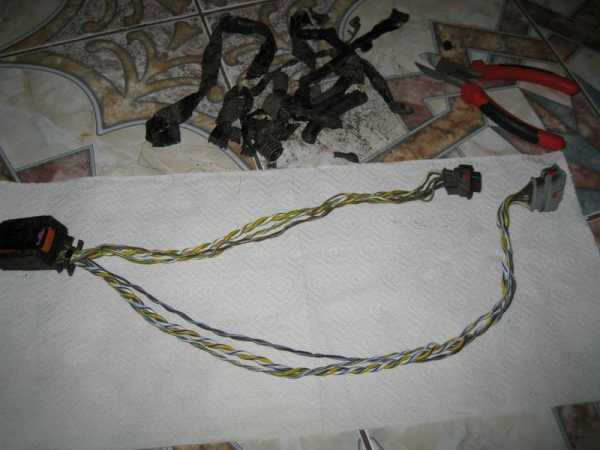 К сожалению, подкапотное пространство перед демонтажом не заснял. Поэтому изображу схематично как проходил этот кабель. Он был стянут заводской изолентой с общей “косой” и поверх этого на них еще был натянут гофр, разрезанный вдоль и местами схваченный изолентой чтобы не расходился. Вобщем-то особой грязи и влаги я там не увидел, но то что они туда свободно попадают (как и на сами разъемы снаружи) – это факт.