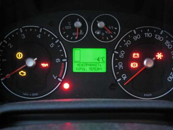 Изнутри салона неисправность выглядит так. Горит сообщение “Неисправность коробки передач”. На БК, где указывается выбранная передача и режим езды – пустое окошко: