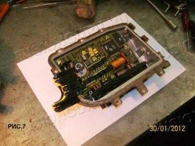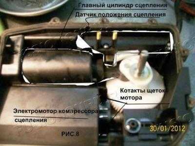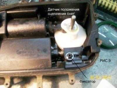5. Половиним ИУС, открутив по периметру кучу болтиков, и получаем две половинки; одна-блок TCM (РИС.7) c 4-х пиновым разъемом-откладываем в сторону, и вторая-электрокомпрессор, главный цилиндр сцепления и датчик положения сцепления !!!, положение которого желательно запомнить с помощью маркера и не сбивать,смотри РИС. 8. Об этом уже писали на форуме. Для снятия разъема надо отодвинуть в сторону фиксатор, смотри РИС.9.
