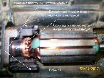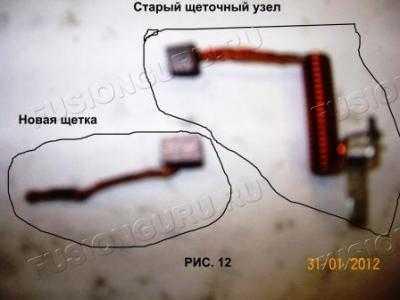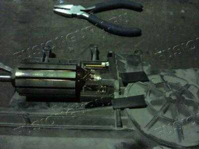 7. Подогнув фиксаторы на (два крайних на РИС.8) контактах щеток электромотора и удалив з ащитные пластины (РИС.11) извлекаем щетки на “улицу” для перепайки, смотри РИС. 12.