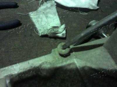 3. Предварительно отстегнув с помощью шила проволочный стопор (на фото не видно), вытаскиваем нижний быстросъем исполнительного устройства сцепления и оба его конца, чтобы не попала грязь, заматываем полиэтиленом, смотри РИС.5.