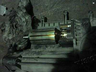6. Теперь с тыльной стороны мотора, смотри РИС. 10, снимаем фиксирующий кронштейн и, открутив два болта , извлекаем кожух электромотора с постоянным магнитом внутри и видим черные затертые остатками щеток контактные ламели якоря, одна щетка вообще не касается якоря, смотри РИС. 11.