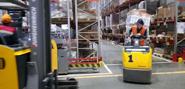 Первое, что бросается в глаза -это электропогрузчики, которые с большой скоростью, но очень четко двигаются по «магистралям»