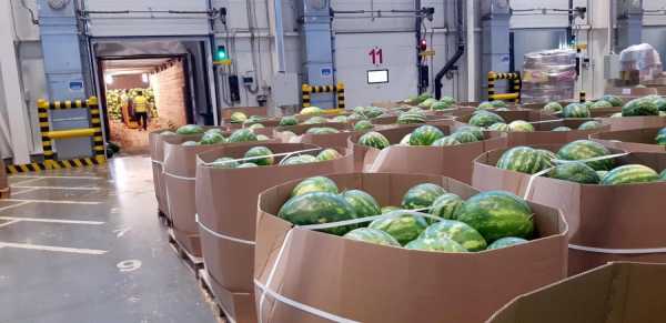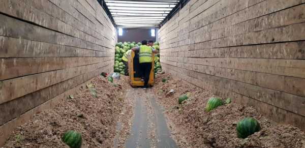 Арбузы разгружают и раскладывают по таким коробкам, стоящим на деревянных поддонах, «палетам»
