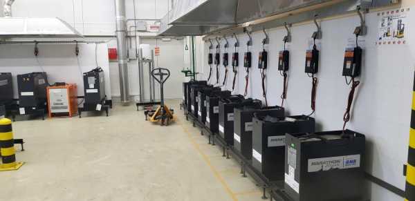 Здесь заряжаются аккамуляторы для погрузчиков.