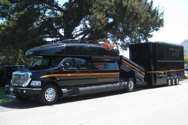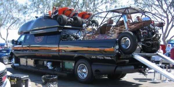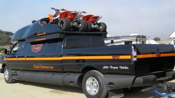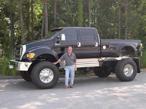 Одним из самых больших пикапов считается американский Ford серии F-750, доработанный компанией Dunkel Industries. Длина этого полноприводного автомобиля составляет 32 фута (около 9,75 метров), ширина — 8,5 футов (почти 2,6 м), высота — 12 футов (3,66 м). Наверное, парковаться на таком огромном грузовике не слишком удобно. Зато водитель и пассажиры не обижены комфортом. В их распоряжении диван, телевизор, кровать и даже уютная кухня, на втором ярусе находится площадка для перевозки мототехники (на ней легко поместится пара квадроциклов либо пять-шесть мотоциклов или велосипедов). Кроме того, автомобиль оснащен откидным кузовом для перевозки вещей и закрытым прицепом, в который без проблем поместится небольшой родстер.