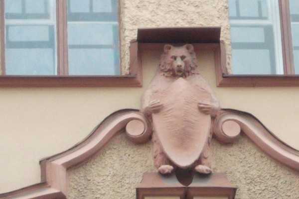 Сначала мы прошли прямо под этим домом и я ничего не увидела, а когда перешли на противоположную сторону, мне показали медведей со щитами в лапах. Интереснейшая тема — животные, охраняющие мир живущих в доме людей.