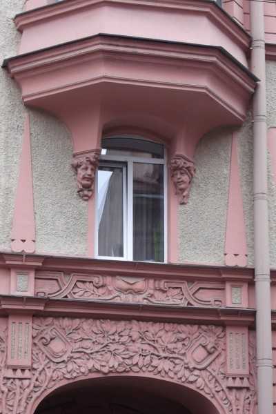На этом доме над арочными окнами человеческие лица, а над квадратными тоже какие-то зверюшки.