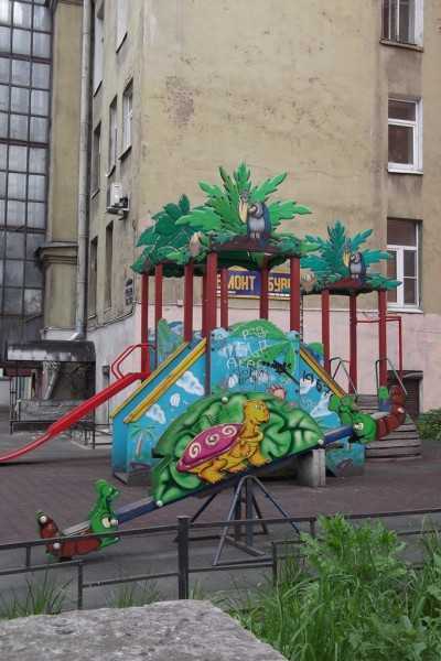 К середине второго дня, проведённого в северной столице, я начала уже думать о несчастных городских детях, лишённых нормальных площадок. Но совсем рядом с Вериной работой обнаружилась совершенно чудесная детская площадка. Есть у вас в городе жёлто-сине-красный домик-горка, инкубаторский привет? Малыши из этого серого дома выходят гулять в Африку к попугаям, обезьянам, черепахам и пальмам.